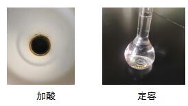 實驗結束,冷卻后取出,轉移至通風櫥中打開消解罐,趕酸定容后,消解液澄清透明。